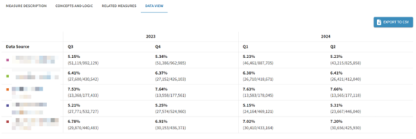 Comparing data just got easier with the new ‘Data View’ tab on the Single Measure View. It showcases a table with the data used in the charts from your selected data sources, tailored to the time selection on the graph. Additionally, you can now export this data via the ‘Export to CSV’ feature.