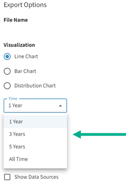 Exporting line charts is now more user-friendly, with time options like 1 Year, 3 Years, 5 Years, and All Time. The export modal will reflect your last time selection for convenience.