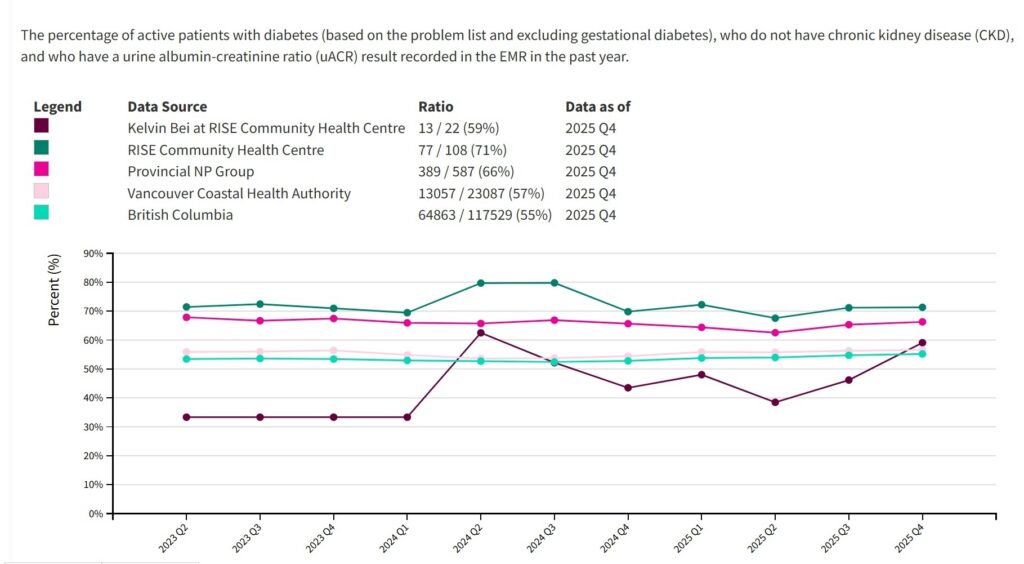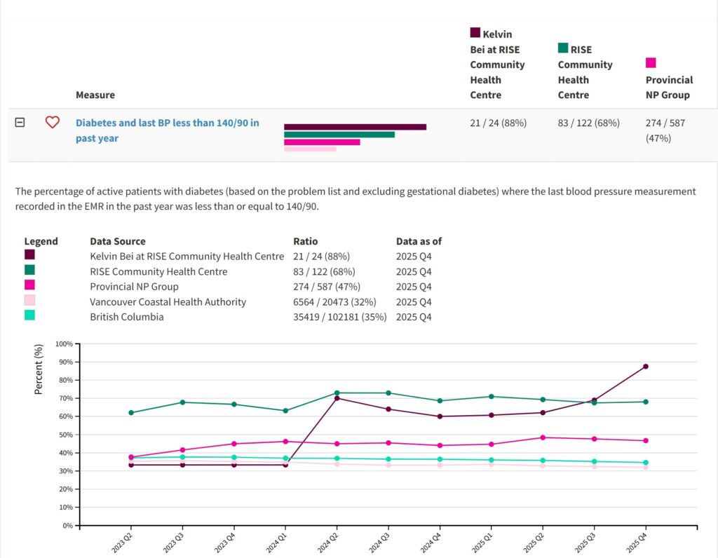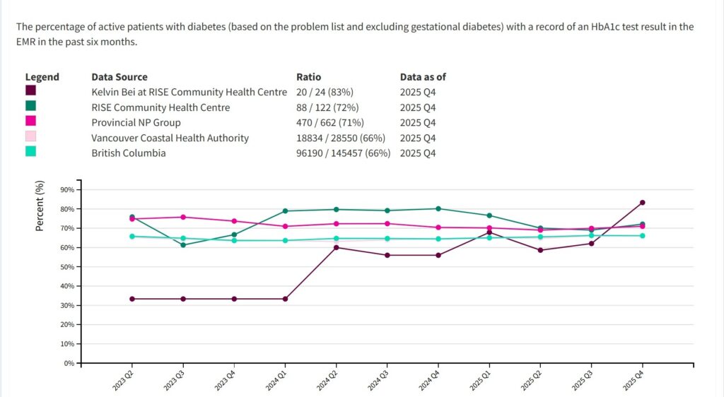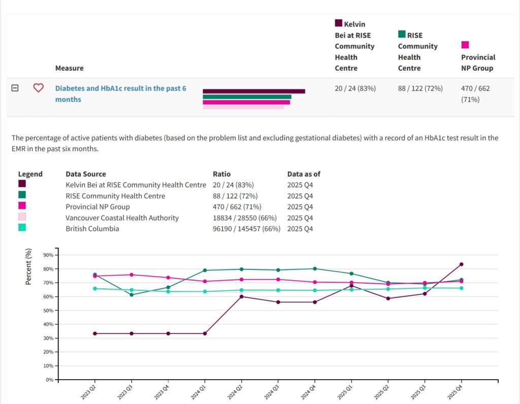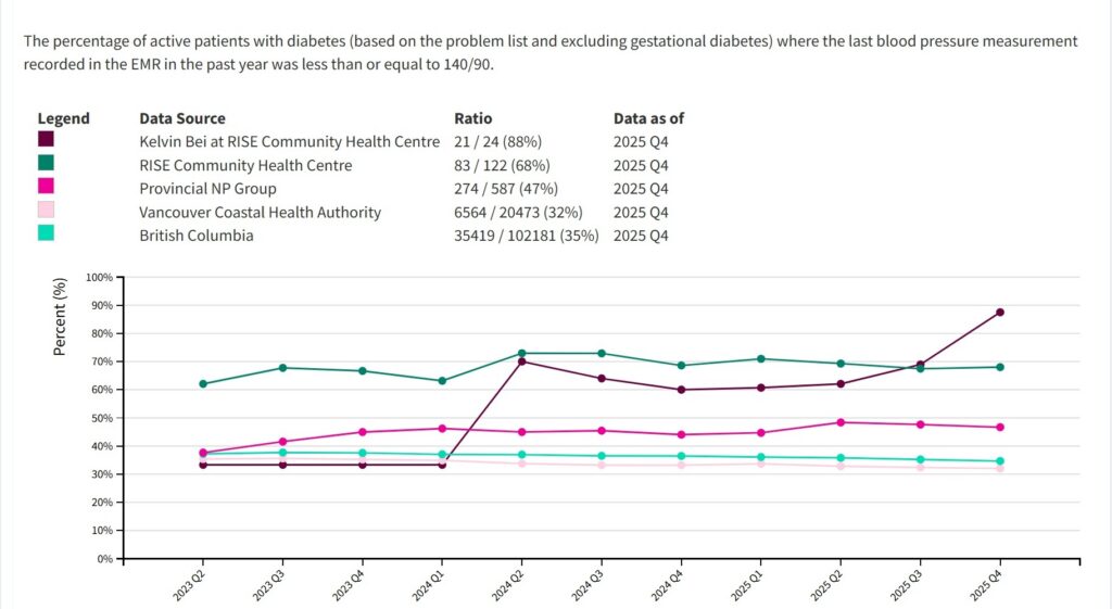 Nurse Practitioner (NP) Kelvin Bei has always believed that high quality primary care requires a patient-centred approach. “We want to automate what we can, but we also need to know our patients as people and take a holistic perspective. Are they falling through the gaps? Can we implement systems to prevent this moving forward?” When his clinic introduced HDC Discover, an application that provides access to community level trends in chronic disease management, Kelvin noticed something interesting. His diabetes monitoring rates were similar to colleagues in his region, but he saw an opportunity to elevate an already strong practice. “…the data in HDC Discover, from my colleagues at RISE, and NPs provincially, helped me realize that there was room for improvement. This provided the encouragement needed to undergo this QI project.”
