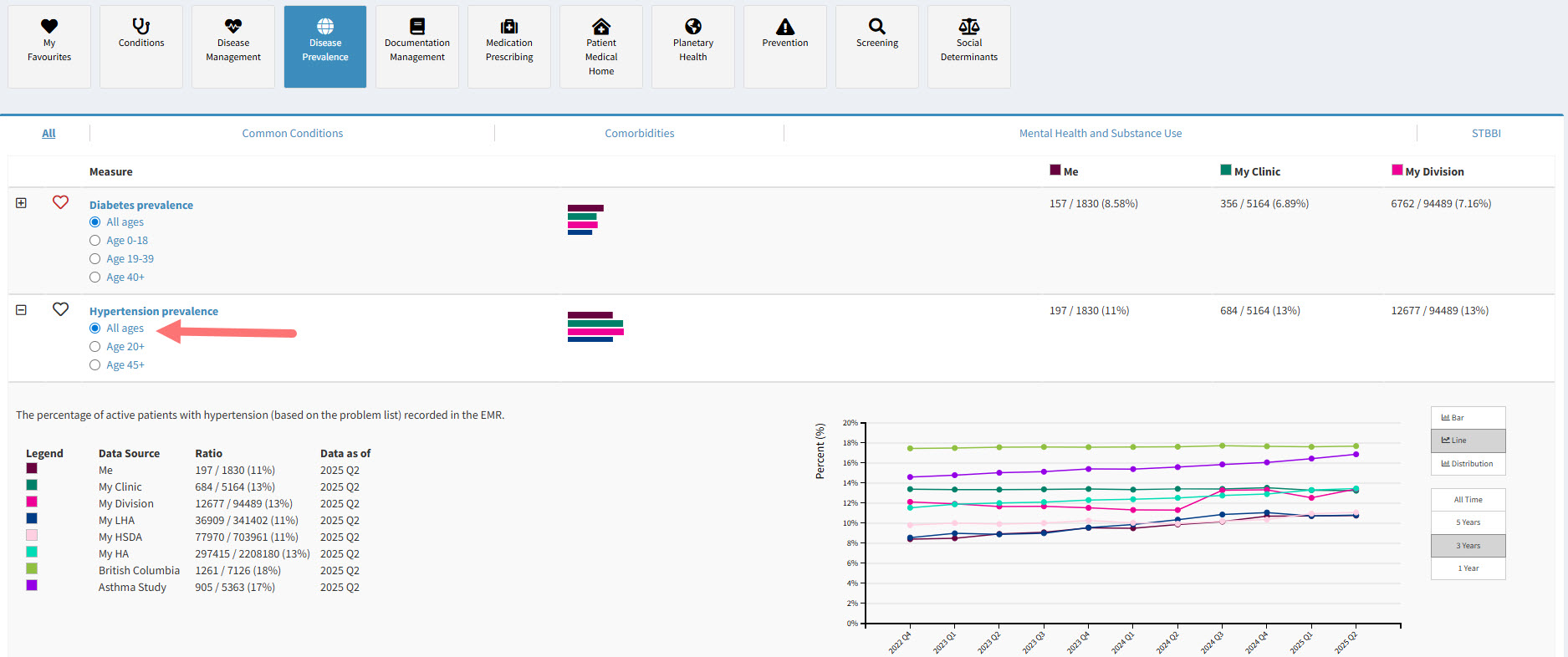 Let’s walk through an example where a user wants to review their own practice prevalence of hypertension measure in relation to their immediate community and geography:
