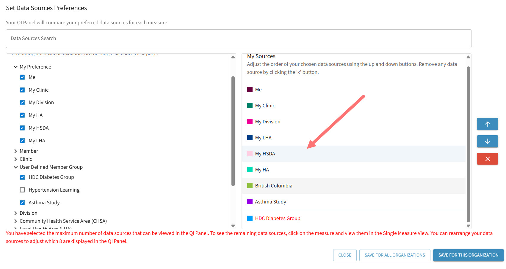 After selecting all your desired data sources, prioritize them based on your interest using the up and down arrow buttons on the right side. Then click Save for this Organization. Click here to learn more about data sources. - View in QI Panel