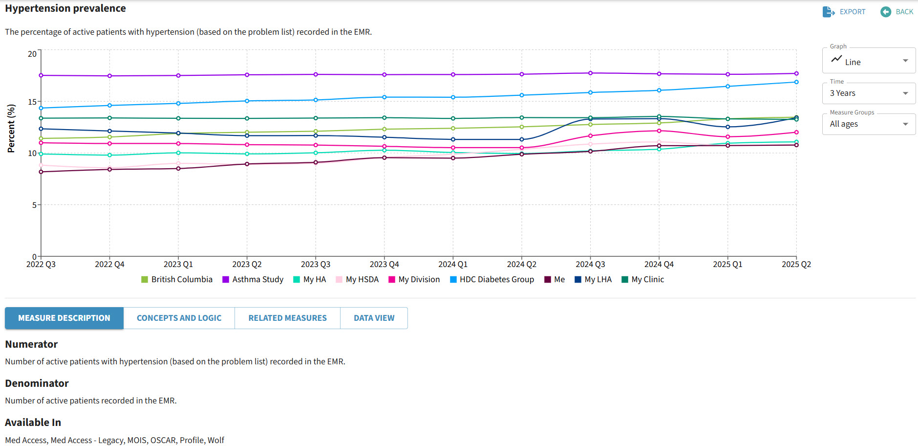 HDC Discover enables users to analyze and compare data across multiple sources, offering valuable insights for discussion. Users can compare their data with their peers, create custom groups, and view group aggregates across specific measures, at different levels of aggregation, whether it’s a specific division, a local health area, a health authority (HA), or the entire province.