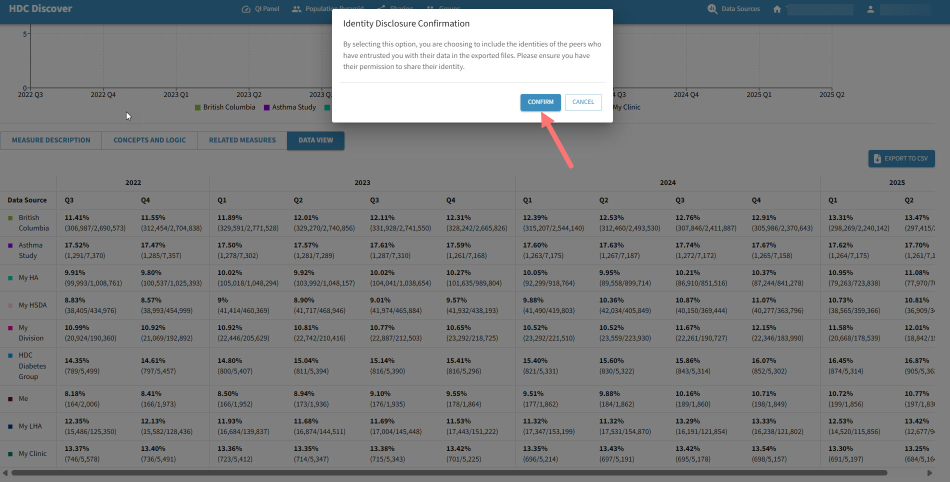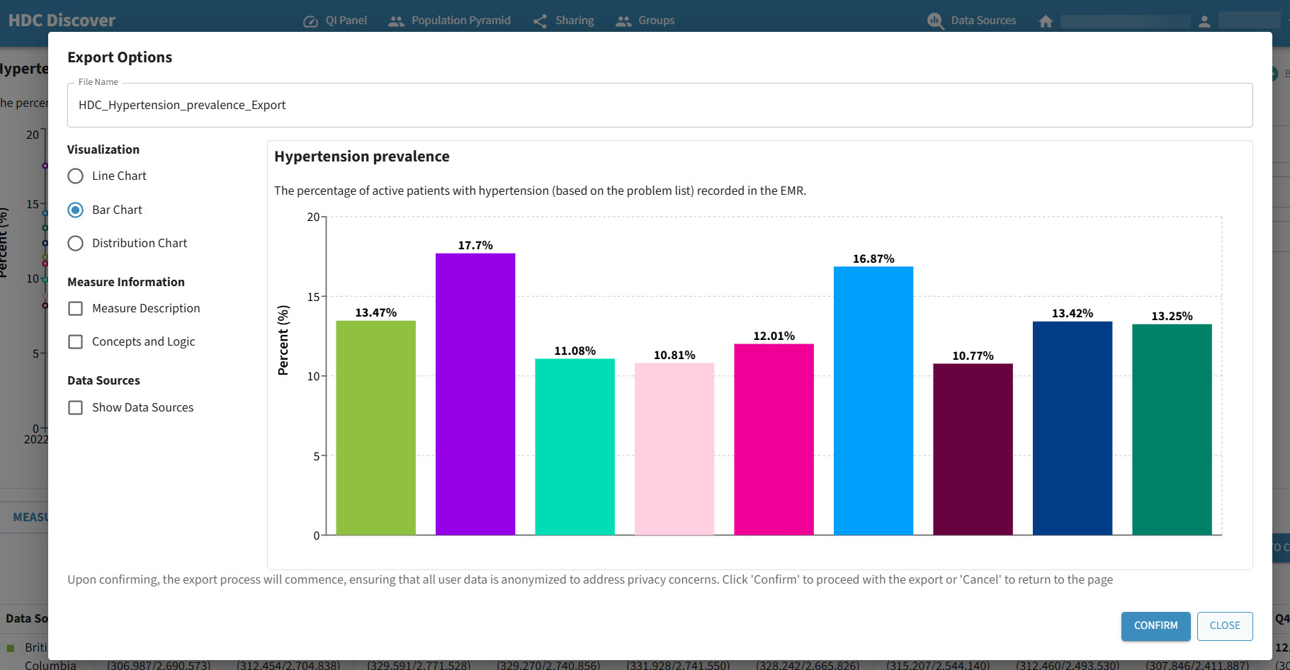 To support these needs, the QI Panel in HDC Discover allows users to view data from up to eight (8) data sources simultaneously for a high-level overview across various measures. For a more in-depth analysis of a single measure, the Single Measure View (SMV) supports comparisons across fifteen 15 data sources. Users also can export graphs and data for further exploration.
