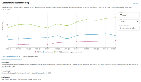 When Dr. Stuckey logged into his HDC Discover account and reviewed his Colorectal Cancer Screening Measure (see image below), he noted that he had successfully screened 64% of his patients.