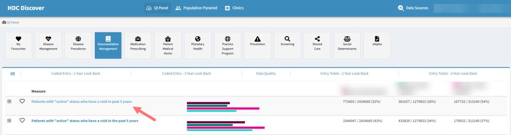 - Search for the Measure: Navigate to the QI Panel, click on the Documentation Management domain, and look for “Patients with active status who have a visit in the past 3 years.” Click on the measure name to access the Single Measure page.