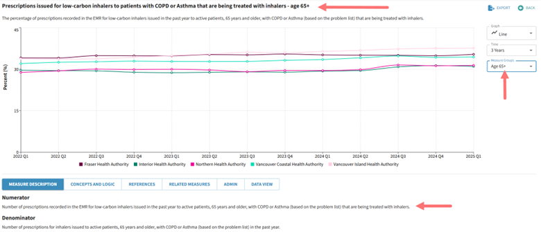 - Navigate down the list to find the Prescriptions issued for low-carbon inhalers to patients with COPD or Asthma that are being treated with inhalers measure.